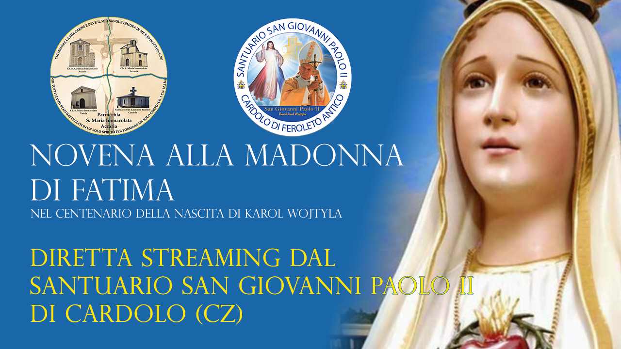 Da oggi 04 maggio 2020, inizia un tempo di 9 giorni che ci porteranno a commemorare la prima apparizione della Madonna del rosario ai pastorelli di Fatima. Questo è anche il mese di maggio, e quest’anno il 18 maggio verrà commemorato il centenario della nascita di Karol Wojtyla e lui – oltre alla Divina Misericordia – è particolarmente legato al disegno e all’opera della Madre di Dio che a Fatima è intervenuta per aiutare l’umanità chiedendo a tre piccoli la preghiera e i sacrifici per ottenere la grazia della conversione dei cuori e la pace nel mondo allora in guerra. Perciò lanciamo un nuova iniziativa di #Unitinellapreghiera con il rosario in famiglia – commemorando le apparizioni della Madonna del rosario di Fatima nel mese e nell’anno centenario della nascita di Karol Wojtyla”.