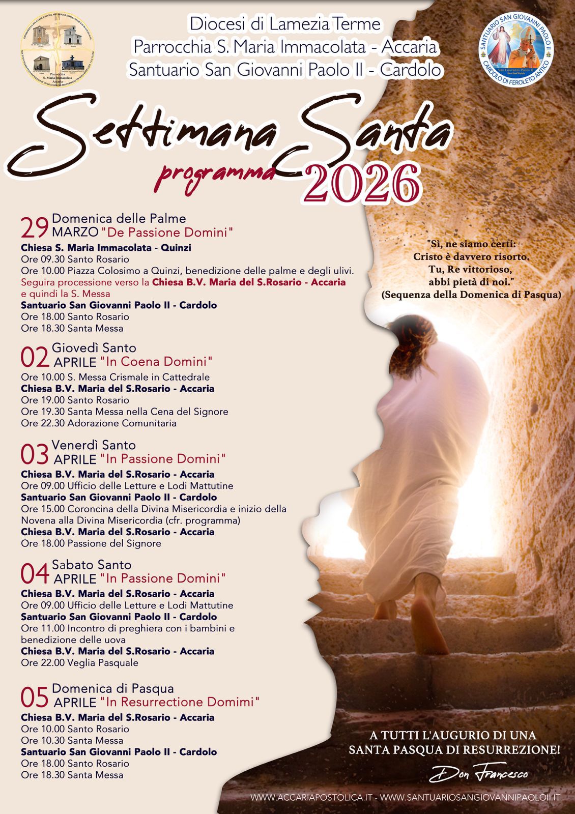 La Settimana Santa è il momento più intenso e significativo dell’anno liturgico. È il tempo in cui la Chiesa ci invita a camminare accanto a Gesù, dalla gioia dell’accoglienza fino al dono totale della croce, per giungere alla luce della Risurrezione.